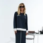 Элегантный женский костюм в деловом стиле, оформленный в классическом черно-синем цвете с тонким вертикальным принтом в виде узких полос. Комплект включает в себя блузку и юбку. Блузка выполнена прямого силуэта, дополнена нагрудными вытачками, которые обеспечивают идеальное прилегание. Особый акцент делается на декоративные элементы в виде планки по низу из отделочной ткани и контрастных белых отделок на манжетах. Спинка блузы оснащена молнией для удобного надевания. Юбка строгого прямого покроя украшена декоративным кантом по передней части, дополнена удобной шлицей для большей свободы движений. Этот костюм идеально подойдет для бизнес-встреч и офисной работы, сочетая в себе стиль и комфорт. Dлины изделий: блузка – 60 см, рукава – 61 см, юбка – 84 см, предоставляя идеальное сочетание элегантности и практичности.