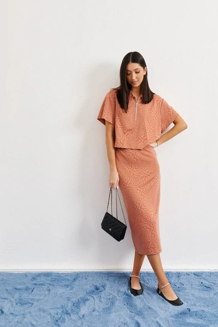 Комплект состоит из джемпера и юбки выполнен из трикотажного полотна с принтом. Характеристики: джемпер прямого свободного кроя, воротник отложной, по переду в области горловины металлическая молния, рукав короткий втачной. Длина изделия по спинке 42, длина рукава 18. Юбка прилегающего силуэта, подкладка, пояс на резинке. Длина юбки 82 см.