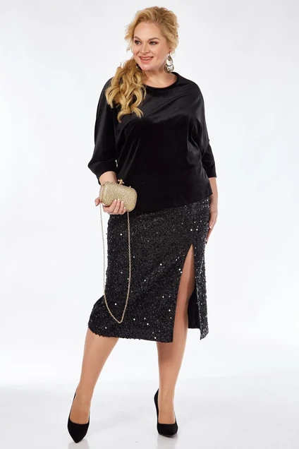 Костюм женский полуприлегающего силуэта,джемпер и юбка.Юбка выполнена из блестящей тани, с отрезной кокеткой , разрезом и каррманоми в боковом шве.Джемпер с цельнокроенным рукавом и разрезами в боковых швах