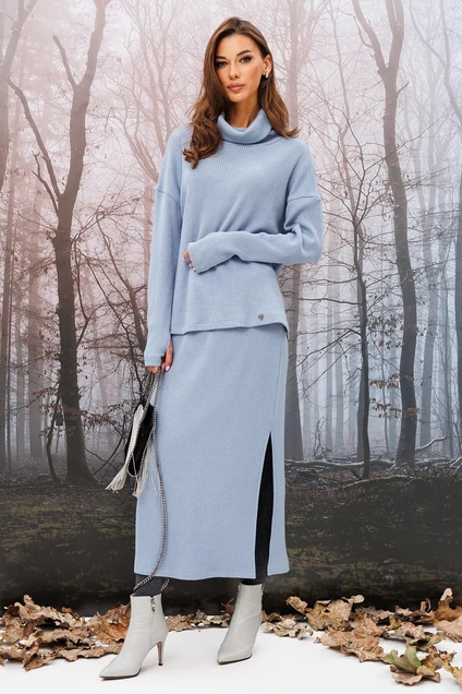 Комплект 2-ух предметный состоящий из джемпера и юбки. Джемпер прямого силуэта со спущенной линией плеча. Рукав втачной длинный, внизу с отверстием для большого пальца. По переду пришито сердце с гравировкой "BUTER". Внизу по боковым швам обработаны разрезы. Воротник стойка с отворотом. Юбка прямого силуэта на притачном отстроченном поясе на резинке и втянутым в него шнурком из основной ткани. По левому боковому шву внизу обработан разрез.
