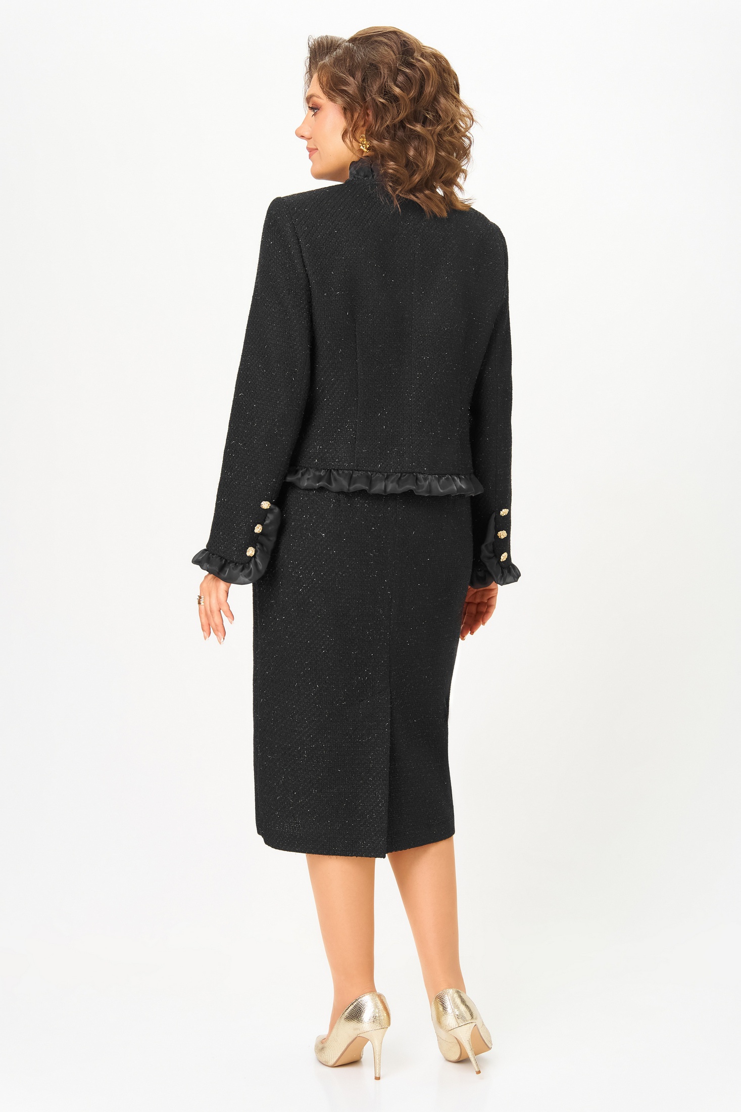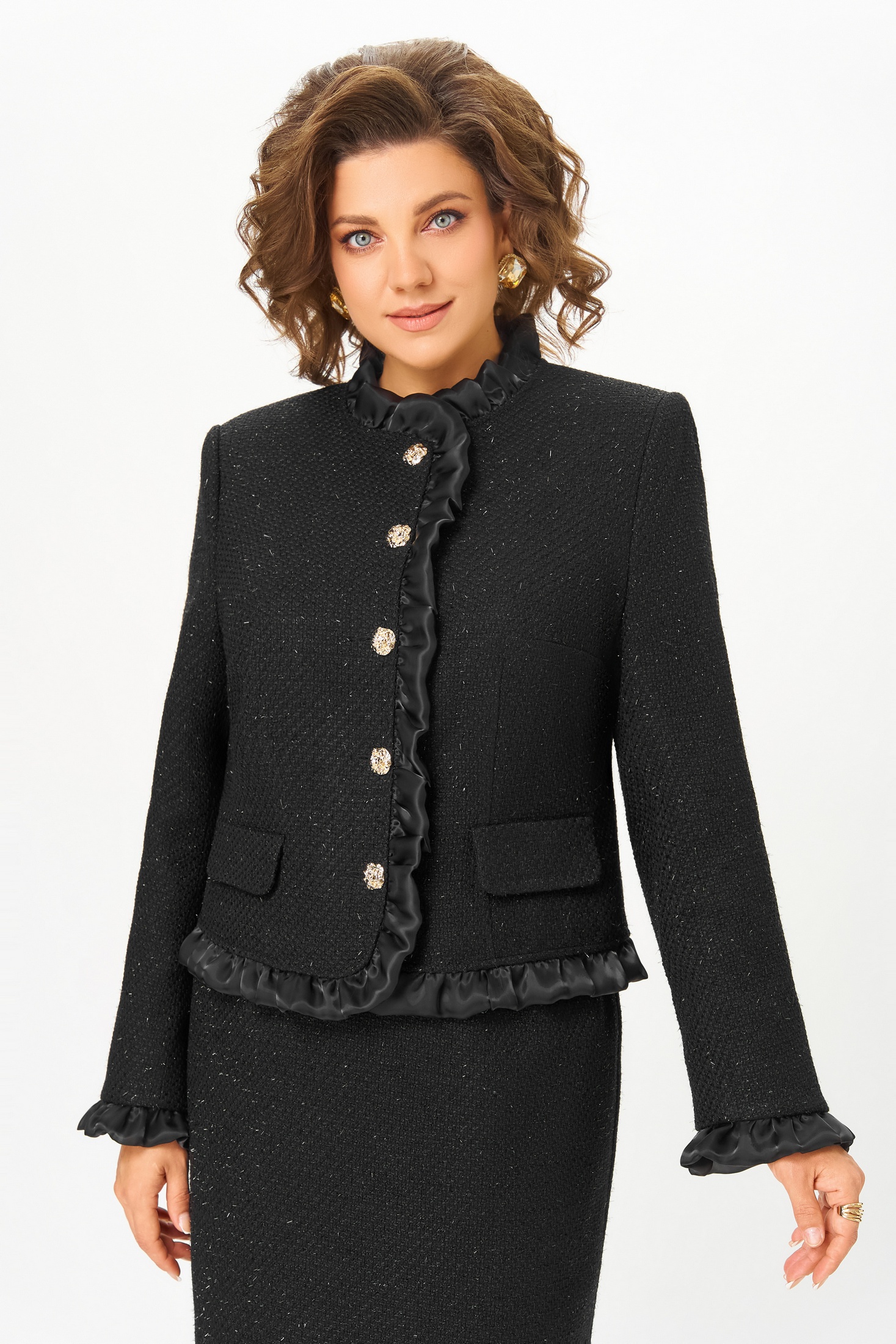 Элегантный женский костюм в черном цвете с тонким белым блеском, который придает изысканность образу. Костюм состоит из жакета и строгой юбки-карандаш. Длина жакета составляет 51 см, а длина рукава — 62 см, обеспечивая комфортное прилегание. Жакет декорирован крупными кнопками и изящной оборкой на планке и манжетах, добавляя романтический акцент. Юбка имеет длину 74 см, подчеркивая силуэт. Костюм отлично подойдет для офиса или деловых встреч, сочетая классический стиль и непринужденную элегантность.