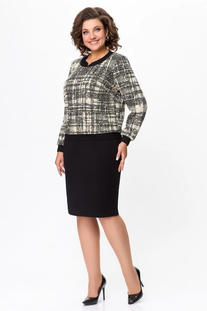 Костюм состоит из блузки и юбки. Блузка имеет принт в виде геометрических линий и узоров в черно-белой цветовой гамме с добавлением бежевых оттенков. У изделия длинные рукава, воротник с лацканами черного цвета, что создает контраст с основным узором. Юбка костюма однотонная, черного цвета, прямого кроя, длиной чуть выше колена. Это классический вариант, который хорошо сочетается с узорчатой блузкой и подходит для офисного стиля или деловых встреч.