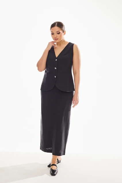 Комплект женский состоящий из жилета и юбки . Комплект выполнен из смесового льна . Юбка прямого силуэта на хлопковой подкладке , верх юбки обработан притачным поясом с резинкой , застежка на молнию , по заднему полотнищу разрез . Жилет полуприлегающего силуэта с центральной застежкой на петли и пуговицы,по талии подрез . По переду жилета накладные карманы .