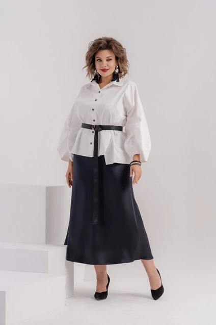 Комплект женский двухпредметный. Блуза из хлопковой ткани свободного покроя. Воротник рубашечного типа, застежка на петли и пуговицы. По переду и спинке декоративные рельефы на обтачках. Рукава втачные на базе цельнокроеных, обьемные, фантазийные. Юбка из атласной ткани на подкладке, А-силуэта, по талии на резинке. комплект дополнен съемным поясом из репсовой ленты с пряжкой. Юбка: ПЭ-100%.