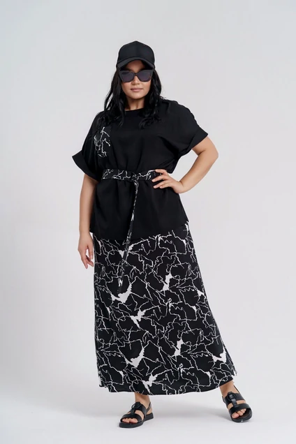 Комплект женский двухпредметный. Блуза свободного покроя из легкой вискозной ткани. Вырез неглубокий округлой формы, рукав цельнокроеный короткий с манжетам. По переду накладной карман из принтованной ткани. В боковых швах разрезы. Длина по спинке - 68 см. Юбка миди с карманами в боковых, пояс с эластичной резинкой. Длина по боковому шву - 93 см. Комплект дополнен съемным поясом на полукольцах.