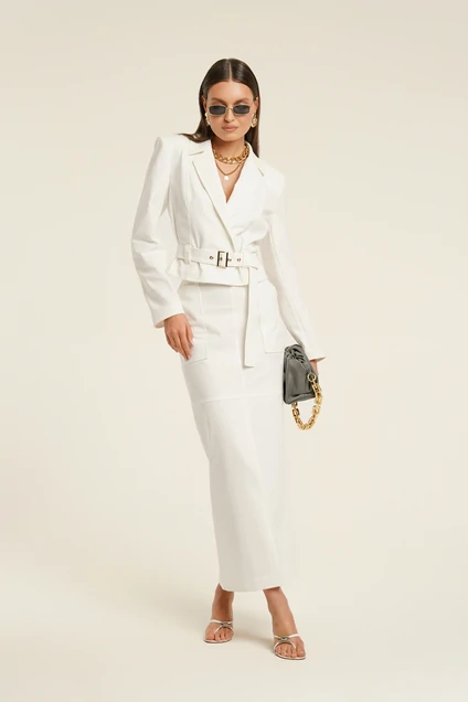 Комплект женский двухпредметный. Жакет прилегающего силуэта, короткий. Воротник пиджачного типа, застежка двубортная на петли и пуговицы. По переду и спинке рельефы. Рукав втачной, двухшовный. Дополнен съемным поясом с пряжкой из основной ткани. Юбка карандаш длиной миди, с высокой посадкой. По переду накладные карманы, декоративный подрез, высокий разрез. Застежка на молнию и петлю с пуговицей.