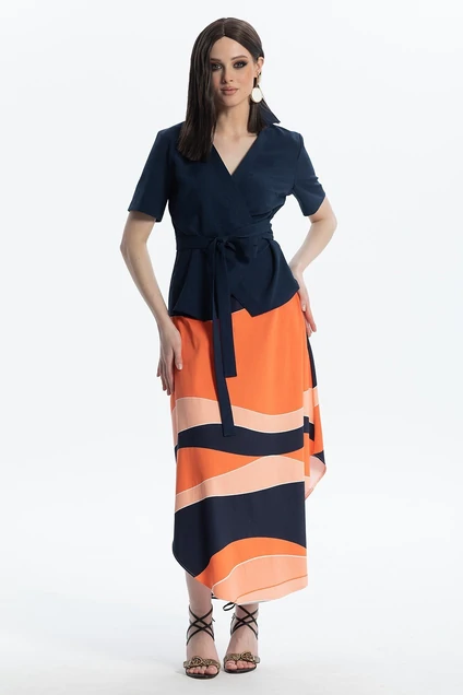 Комплект состоящий из блузки и юбки. Блузка на запах с коротким рукавом, вырез горловины V-образный, воротник рубашечного типа. Юбка А-силуэта, низ округлой формы. Пояс втачной на молнии. Длина юбки 100 см.
