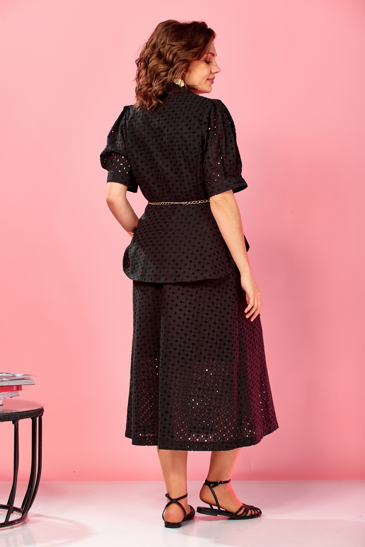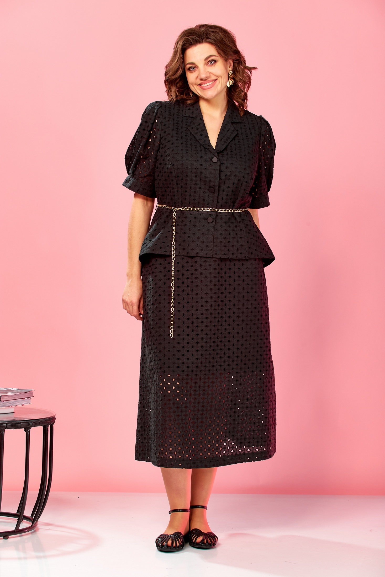 Костюм с юбкой 182 AVA fashion подчеркнет вашу уникальность в любой обстановке. Коллекция бренда AVA fashion предлагает стильный комплект из хлопка 100% с подкладкой для дополнительного комфорта и износостойкости. Жакет с баской и полуприлегающим силуэтом дополнен V-образным вырезом и пиджачным воротником, что добавляет женственности и строгости одновременно. Ремень-цепочка акцентирует на талии, придавая образу завершенность. Юбка A-силуэта с боковыми карманами и эластичным поясом обеспечивает идеальную посадку. Длина жакета по спинке — 67 см, длина юбки — 80 см. Идеально для деловых встреч или особых случаев, доступны в черном цвете.