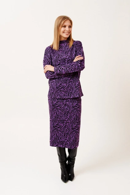 Комплект женский двухпредметный (джемпер+юбка) из трикотажной ткани. Джемпер свободного силуэта, со спущенной линией плеча, длинным рукавом, длиной до середины линии бедер. Вырез горловины лодочка. Юбка прямая, двухшовная, длиной миди. Верх юбки на резинке. Длина джемпера 66 см, рукав от горловины - 70 см. Длина юбки 77 см.