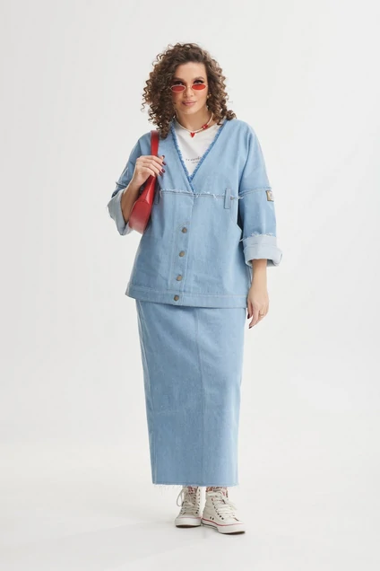 Комплект женский, состоящий из куртки и юбки. Куртка прямого силуэта. По переду кокетка, боковые карманы и декоративные шлёвки. По низу притачная планка. По спинке кокетки, подрезы, декоративные шлёвки, накладные карманы и притачная планка по низу. Застёжка по переду, на потайную кнопку, петли и болты, имитирующая застёжку брюк с гульфиком. Вырез горловины V-образный, с бахромой. Линия плеча спущенная. Рукав втачной, полной длинны, расширенный, с рельефом и цельнокроеной манжетой, которая позволяет регулировать длину. Юбка прямого силуэта. Переднее полотнище с боковыми карманами, средним швом и застёжкой на молнию, петлю и болт. Заднее полотнище с кокетками, накладными карманами, средним швом, заканчивающимся шлицей. Пояс притачной, со шлёвками и резинкой по задней части. Комплект декорирован нашивкой на рукаве куртки, контрастными отделочными строчками, хальнитенами. Низа и некоторые швы комплекта с открытыми срезами.