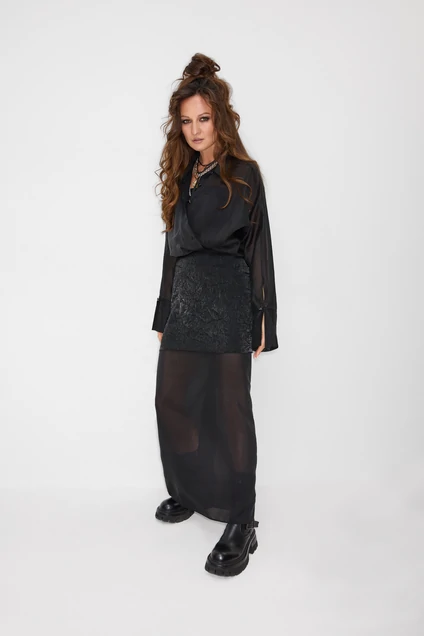 Комплект женский, состоящий из рубашки и юбки. Рубашка с длинным цельнокроеным рукавом, заканчивающимся притачной манжетой (на застежку пуговицу). Воротник стояче-отложной. Перед рубашки с застежкой на планку, петли и пуговицы. Перед с накладными карманами. В боковых швах разрезы. Юбка прямого силуэта, длинная, состоящая из двух видов ткани. Выполнена, как имитация двойной юбки. Верх юбки на обтачке, застежка - молния в среднем шве спинки. Нижняя юбка с высокими боковыми разрезами.