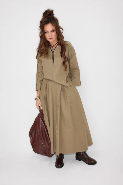 Комплект женский, состоящий из юбки и топа. Топ прямого силуэта. По переду и спинке средний шов с планками с открытым срезом. Вырез горловины - "лодочка". По переду и спинке кокетка, переходящая в рукав с планками с открытым срезом. Рукав втачной, длиной 3/4. Низ рукава и низ изделия с открытым срезом. Топ декорирован термологотипом. Юбка - шестиклинка с дополнительными клиньями в каждом шве. Застежка на потайную молнию в среднем шве заднего полотнища. В боковых швах карманы. Пояс притачной, с резинками по боковым частям, застегивающийся на петлю и пуговицу. Стачные швы клиньев и низ выполнены открытым срезом (необработаны).