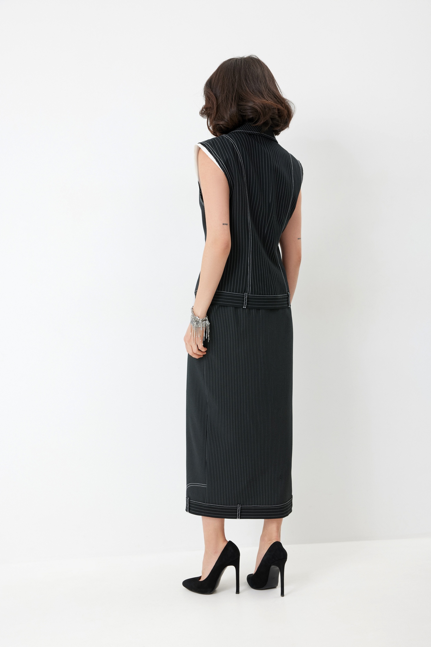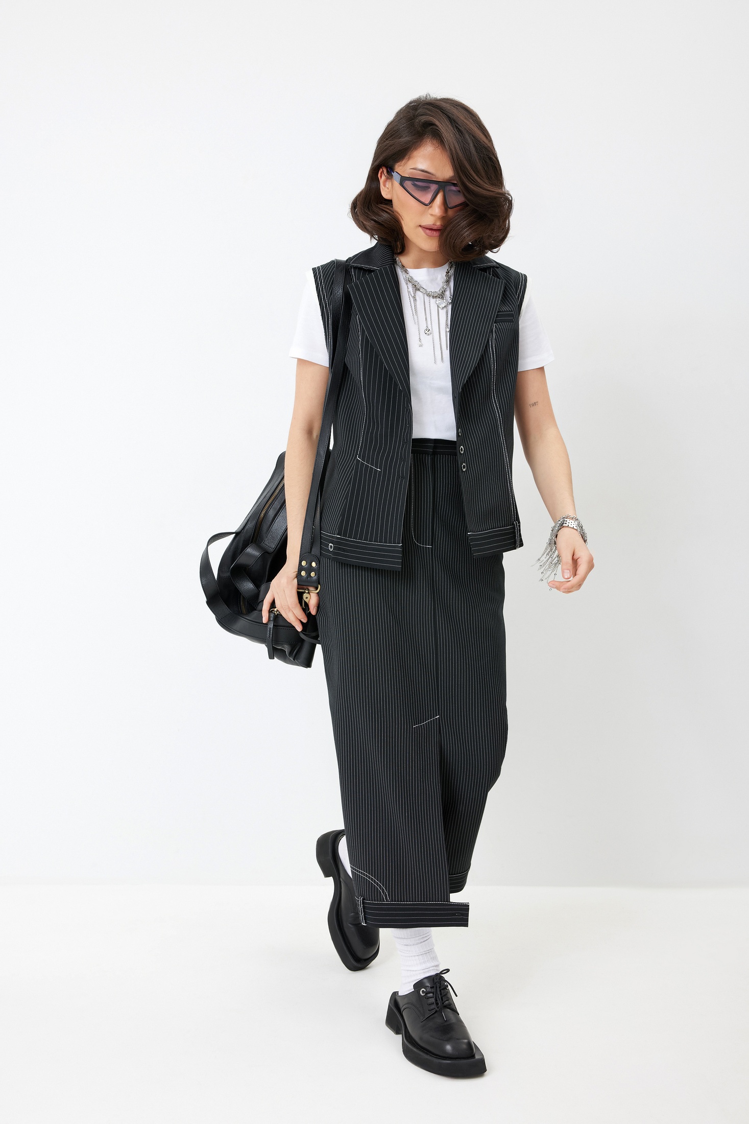 Костюм с юбкой 1324 ElPaiz — идеальное сочетание стиля и практичности. Коллекция бренда ElPaiz предлагает женский костюм, состоящий из жилета и юбки, выполненный в полоску. Ткань костюма содержит вискозу и спандекс, что обеспечивает комфорт и удобство. Жилет с рельефами и имитацией нагрудного кармана подчеркивает фигуру, а юбка прямого силуэта с боковыми карманами и притачной планкой завершает образ. Костюм подходит для делового и повседневного стиля, предлагая универсальность в носке. Доступен в классическом чёрном цвете, сделает ваш образ стильным и современным. Средний шов на спинке и декоративные строчки добавляют изюминку и элегантность.