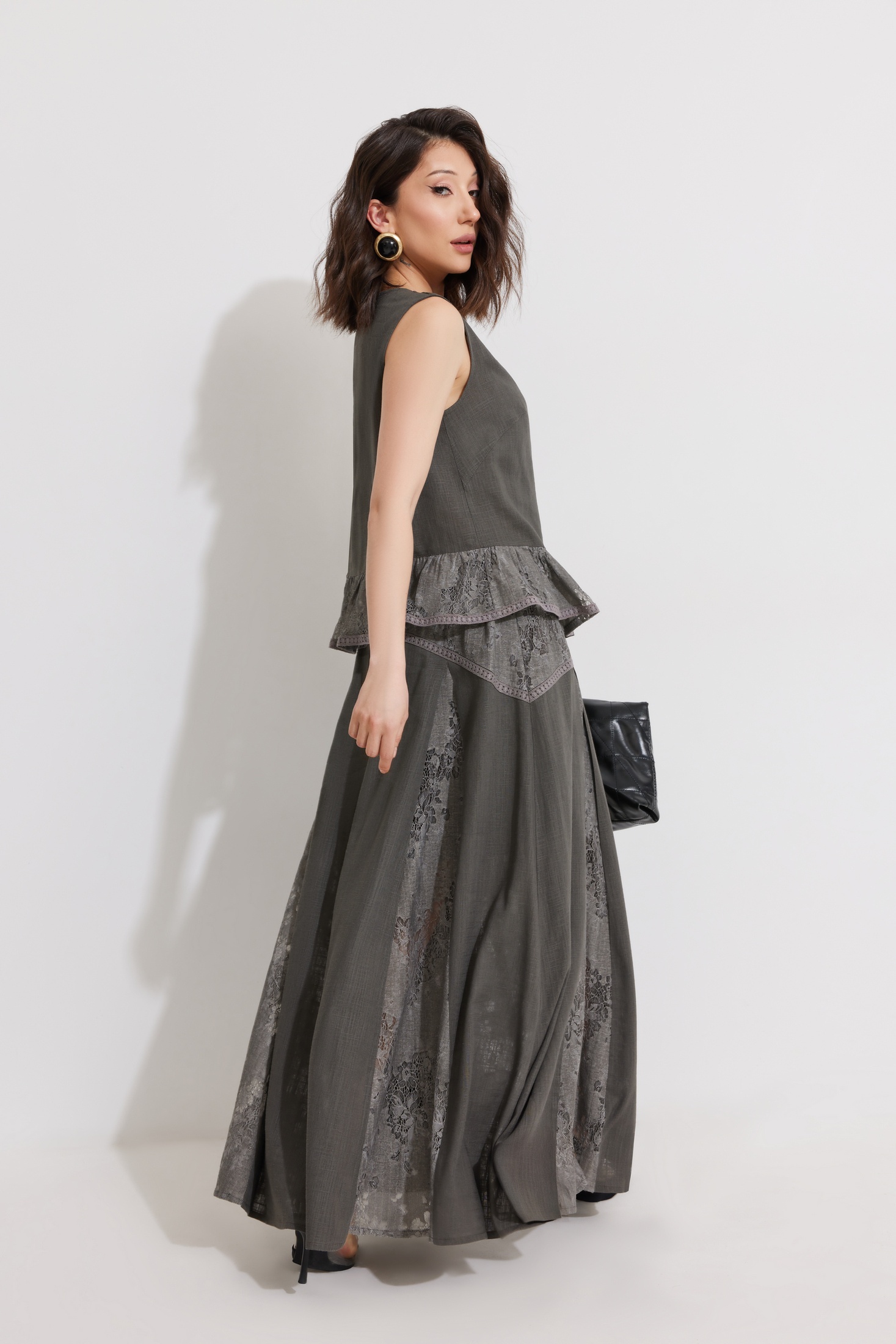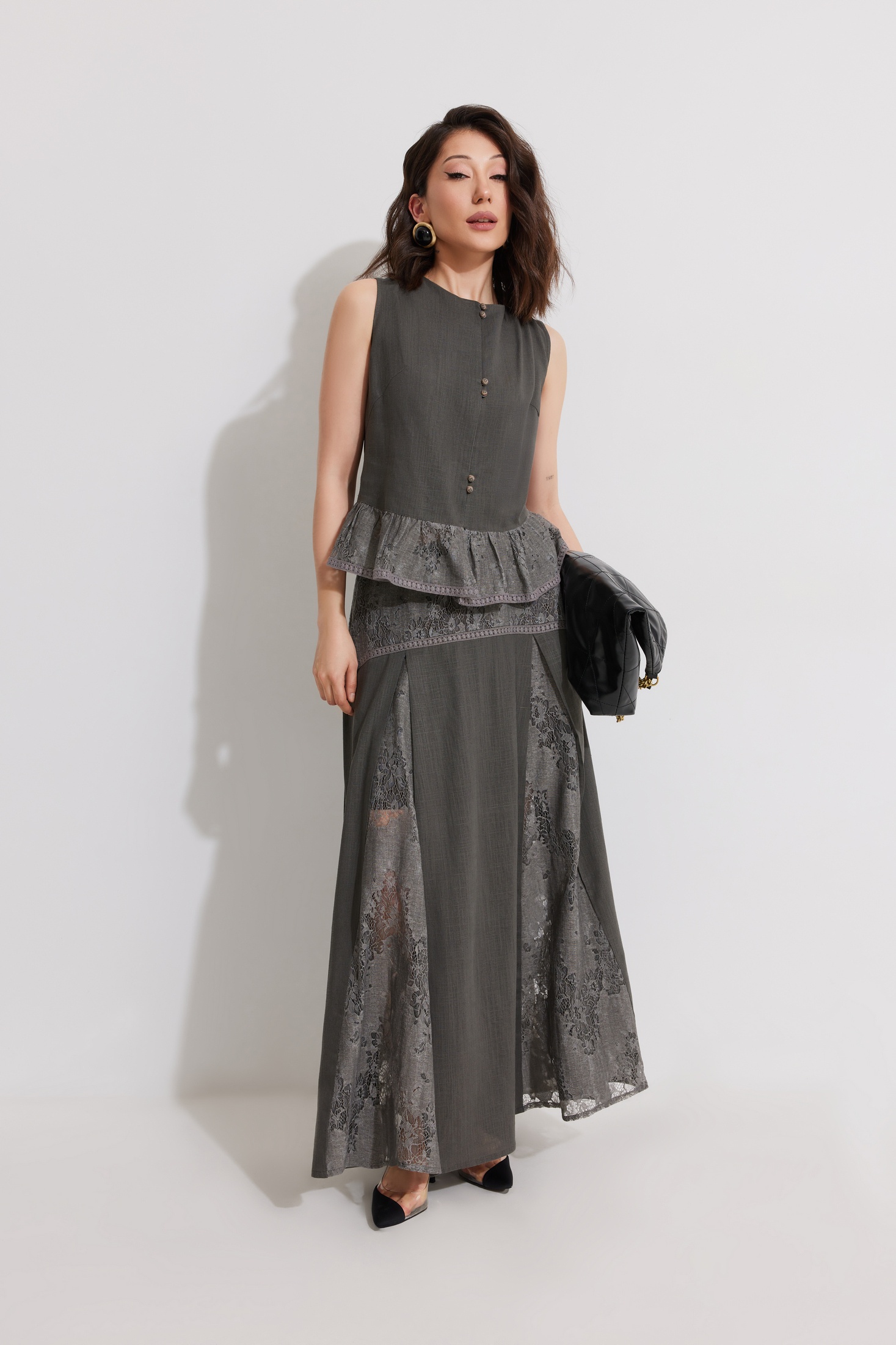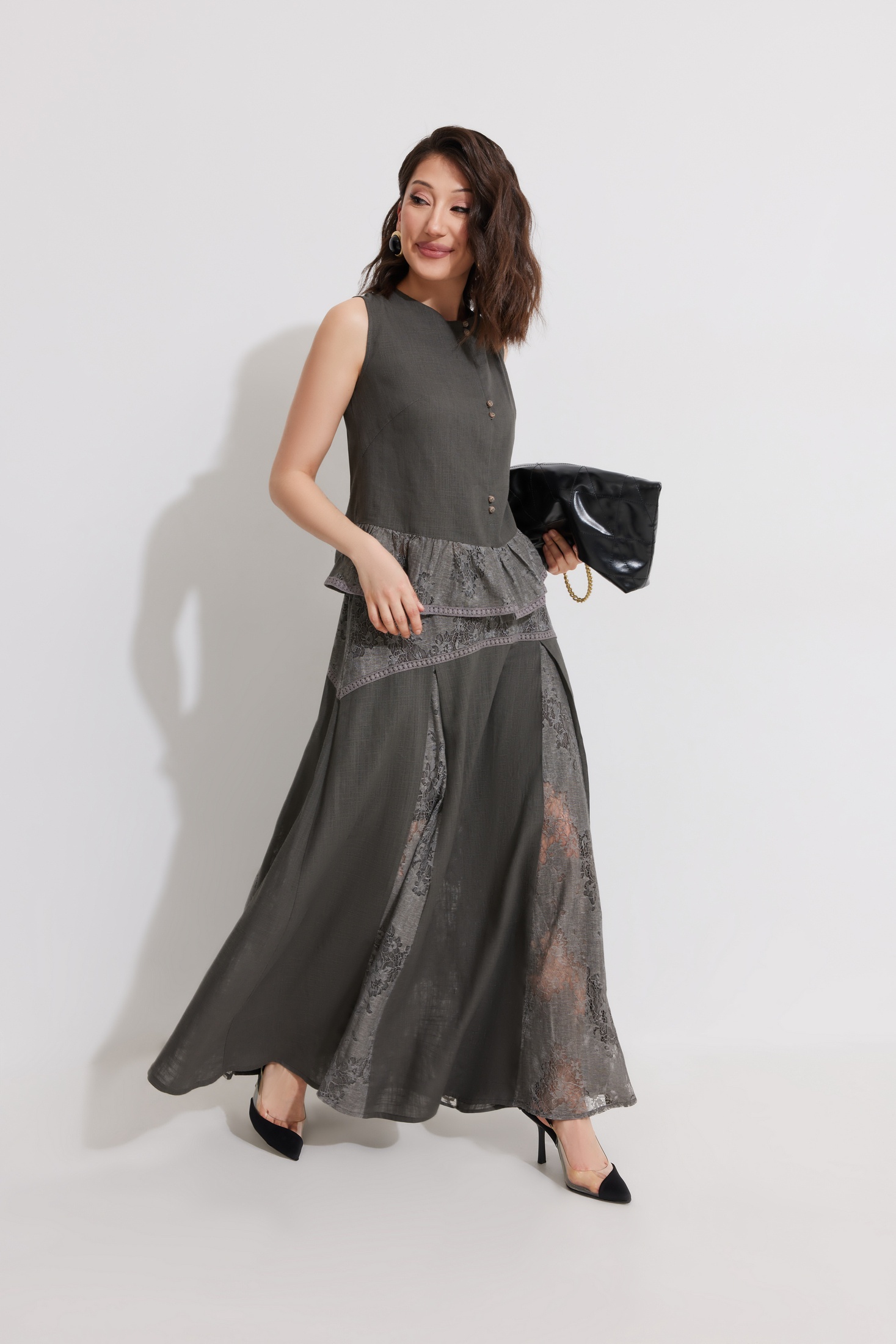 Костюм с юбкой 1351 ElPaiz — это стильный и комфортный выбор для вашего гардероба. Коллекция бренда ElPaiz представлена комплектом из блузы и юбки, выполненных из смеси льна и вискозы с хлопковой подкладкой. Блуза прямого силуэта без рукава, украшенная гипюром, идеально подходит для теплого сезона. Юбка А-образного силуэта с фигурной кокеткой и гипюровыми клиньями добавляет изящества вашему образу. Притачная кулиса со шнуром и резинкой обеспечивает удобную посадку. Комплект выполнен в сдержанном сером цвете, что делает его универсальным для различных случаев — от делового обеда до приятной вечерней прогулки.