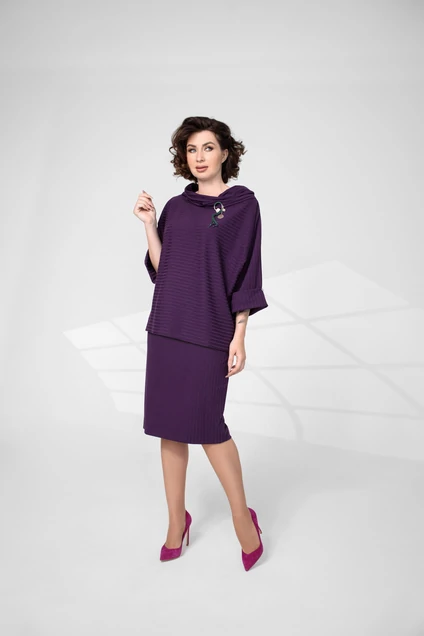 Костюм женский, состоящий из джемпера и юбки. Джемпер прямого силуэта. Рукав цельнокроеный с притачной манжетой. Воротник - стойка, на расширенной горловине. Юбка прямого, зауженного к низу силуэта. Пояс притачной с резинкой. В комплекте брошь.Комплект выполнен из трикотажного полотна.