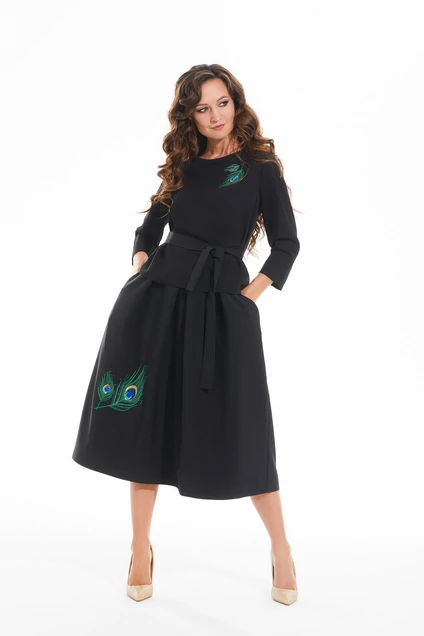 Костюм женский, состоящий из блузы и юбки. Блуза прямого силуэта. Перед со встречной складкой от плеча и вытачкой. Рукав втачной, с рельефом, длиной 3/4. Юбка прямого силуэта со складками от пояса. По переднему полотнищу карманы. Пояс притачной. Средний шов заднего полотнища с застежкой на потайную молнию, петлю и пуговицу. Юбка на подкладке. В комплекте пояс из основной ткани. Костюм декорирован вышивкой.