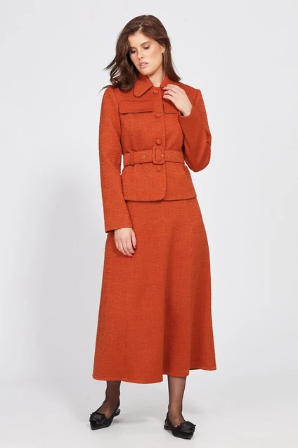 Комплект: жакет + юбка. Комплект выполнен из твида. Жакет полуприлегающего силуэта, длиной выше линии бедер. Застежка спереди центральная бортовая на пуговицы. Спинка со средним швом и талиевыми вытачками. Рукав втачной, двухшовный. Жакет на притачной по низу подкладке. Юбка расширена к низу, на притачном поясе, длиной миди. Застежка в левом боковом шве на пуговицу и потайную молнию. Переднее и заднее полотнище состоит из трех клиньев. Юбка на отлетной по низу подкладке. В комплект входит ремень из основной ткани с обтяжной пряжкой.