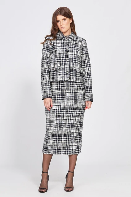Комплект: жакет + юбка. Комплект выполнен из твида. Жакет прямого силуэта, длиной выше линии бедер. Застежка спереди центральная бортовая на пуговицы. Спинка цельная. Воротник стояче-отложной закругленной формы. Рукав втачной, двухшовный. Жакет на притачной по низу подкладке. Вортник, борт, клапаны, низ жакета и рукава декорированы контрастным кантом. Юбка заужена к низу, на притачном поясе, длиной миди. Застежка сзади на потайную молнию и пуговицу. Переднее полотнище цельное. Сзади в среднем шве разрез. Юбка на отлетной по низу подкладке.
