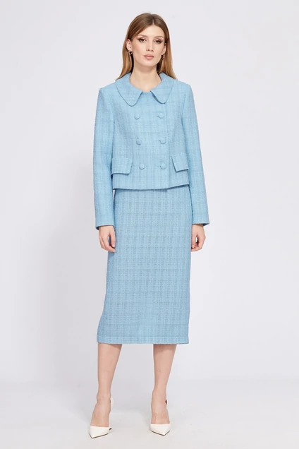 Комплект: жакет + юбка. Комплект выполнен из твида. Жакет прямого силуэта длиной выше линии бедер. Спереди декоративные клапаны и двубортная застежка на пуговицы. Спинка со средним швом. Воротник плосколежащий. Рукав втачного кроя, двухшовный. Жакет на притачной по низу подкладке. Юбка длиной миди, зауженная к низу, на притачном поясе. Сзади в среднем шве разрез и застежка на потайную молнию. Юбка на отлетной по низу подкладке.