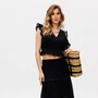 Комплект: блузка + юбка. Комплект выполнен из гипюра. Блузка приталенного силуэта, длиной выше линии бедер, отрезная по линии талии. Спереди рельефы и центральная застежка на пуговицы. Горловина округлой формы. На спинке рельефы. Рукав-крыло по окату. Низ блузки в виде баски, присборенной по линии талии. По низу рукавов и баски фестоны. Блузка на притачной по низу подкладке. Юбка зауженная к низу, длиной миди, на притачном поясе. Спереди центральная застежка на пуговицы. По низу юбки фестоны. Юбка на отлетной по низу подкладке.