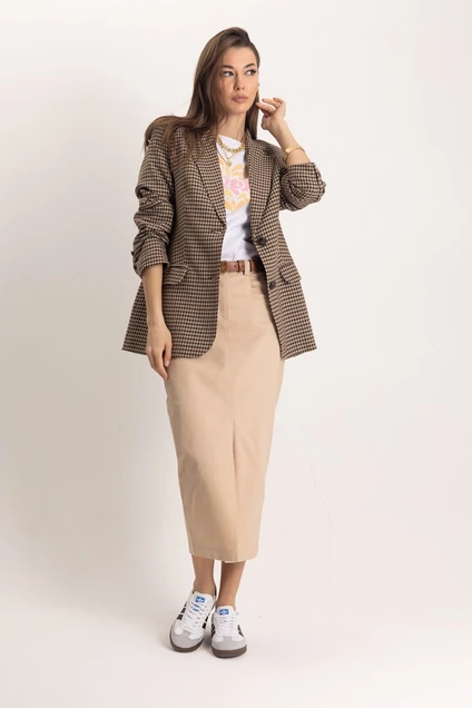 Классический элегантный однобортный приталенный жакет в клетку на основе не мнущейся поливискозы с карманами-клапанами, декорирован лаковыми пуговицами из красного дерева. Жакет идеально рифмуется с песочно-бежевой юбкой-миди.
