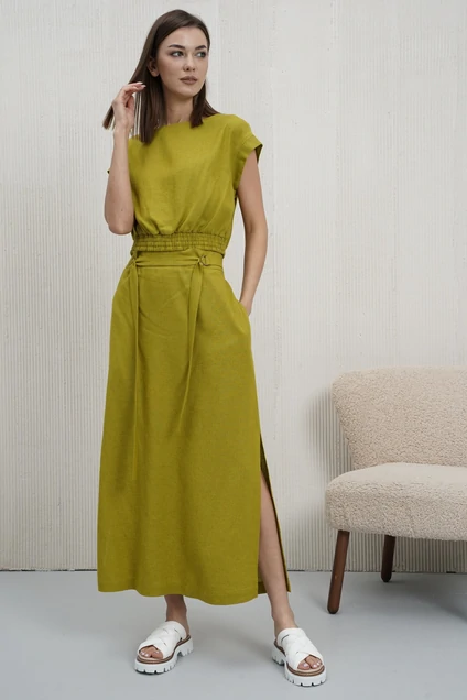 Секрет успеха льняного костюма заключается не только в его красоте, но и в комфорте, в возможности создавать многогранные луки и сногсшибательные ансамбли. Льняной комплект состоит из укороченной блузы-топа и юбки. Такие модели всегда смотрятся стильно и женственно. Форма топа-упрямлённая с широкой эластичной тесьмой по линии низа, простроченной тремя узкими строчками. Вырез горловины в форме лодочки по переду и с углом по спинке. Застёжка сзади на потайную пуговку с разрезом-капелькой в среднем шве спинки. Спущенная линия проймы оформлена широкой полоской. Юбка прямая, длинная с высокими разрезами в боковых швах. Пояс притачной с узким отделочным пояском на патах по переду и эластичной широкой тесьмой по спинке - для лучшей посадки на любой талии. Для удобства эксплуатации - карманы в боковых швах. Длина блузы-топа по спинке около 44 см. Длина юбки около 90 см.