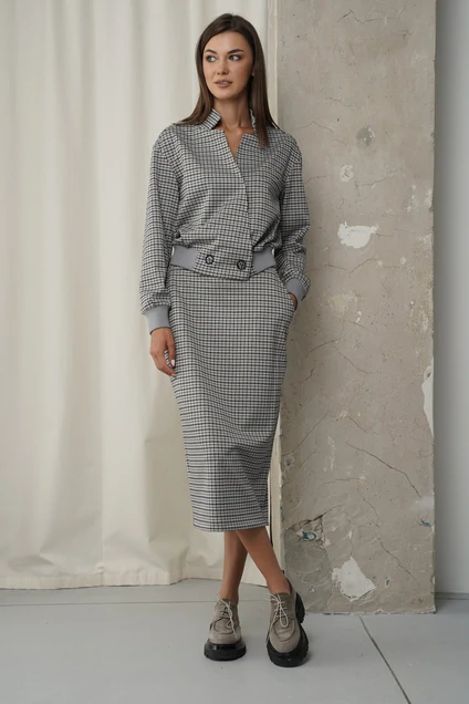 Женские костюмы уже давно стали ответом на вопросы стиля. Костюм - это уже готовый завершенный образ. Один из модных трендов сезона - сочетание юбки длинны миди и укороченного жакета. Модная расцветка, свободный покрой с заниженной линией плеча, воротник - стойка, переходящая в фигурную линию борта. Застежка - двубортная на пуговицы и потайные магниты. По низу жакета и рукавов - трикотажный эластичный довяз. Юбка прямая, на передних половинках боковые наклонные карманы. На задних половинках кокетки и накладные карманы в направлении под углом 45 градусов и высокая шлица. Длина жакета около 52 см. Длина рукава с плечом около 73 см. Длина юбки около 68 см