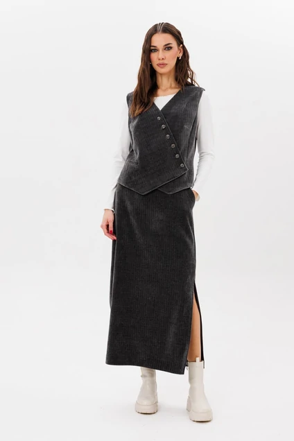 Юбка прямая с застёжкой и боковыми карманами по переднему полотнищу, и разрезом сбоку, из текстильного трикотажного полотна эффекта "вельвет". Пояс эластичный в области спинки.