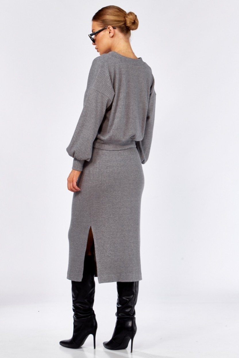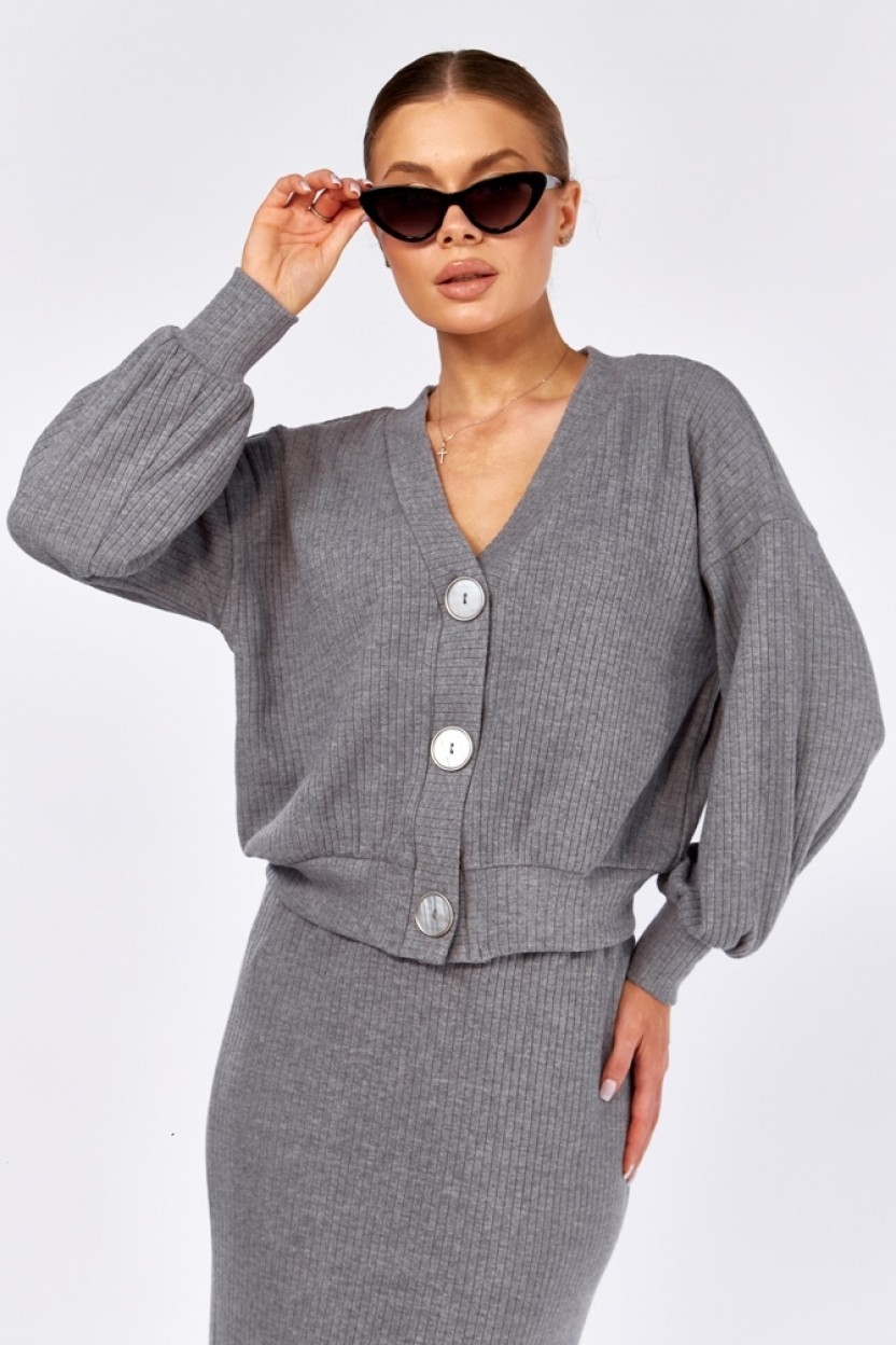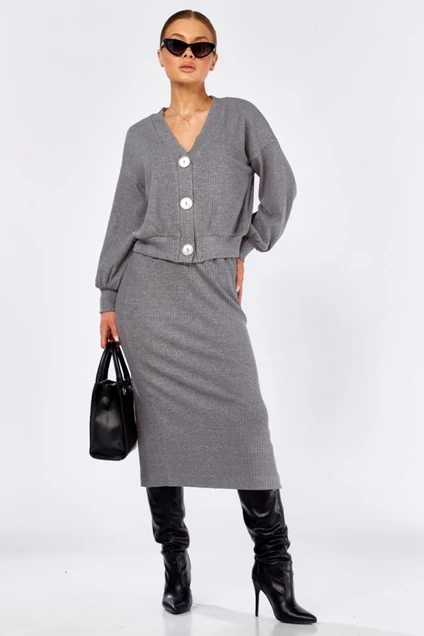 Элегантный женский костюм с юбкой, выполненный в сером цвете, идеально подойдет как для офиса, так и для светских мероприятий. Костюм включает в себя стильную юбку миди и уютный вязаный жакет. Жакет оснащен удобными длинными рукавами, широкими манжетами и акцентирован крупными белыми пуговицами на передней планке, добавляющими изысканное заметное украшение. Прямая юбка деликатно облегает силуэт, способствуя созданию грациозной и собранной фигуры. Вязаный материал не только выглядит стильно, но и обеспечивает комфорт при носке. Этот наряд станет прекрасным дополнением к гардеробу каждой модницы, ценящей комфорт и элегантность.