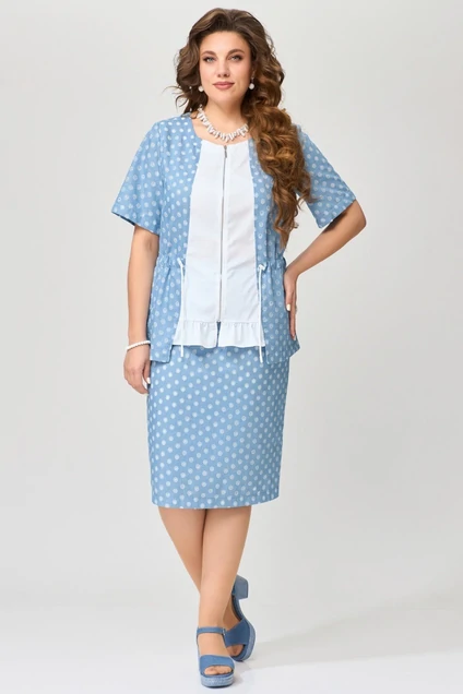 Женский комплект ХАЙДА состоит из юбки и блузки, выполнен из тонкой джинсовой ткани. Блузка полуприлегающего силуэта с кулисой по талии. Горловина в платье округлая, застежка с разъемной молнией. По центру полочки блузка декоративная вставка с рюшей по низу, по спинке - кокетка. Рукав в блузке втачной, низ рукава обработан швом в подгибку с закрытым срезом. Низ изделия обработан швом в подгибку с закрытым срезом. Юбка зауженная к низу, по спинке юбки - шлица, на поясе по бокам резинка, застежка на потайную молнию и пуговицу. Этот комплект легкий в носке, летом не парит, отлично подходит для выхода в город, для праздников и для повседневной носки.