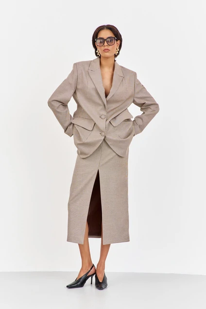 Костюм жакет с юбкой. Жакет свободного кроя. Характеристики: выполнен из костюмной ткани в принте"гусиная лапка" капучино, однобортная застежка на петли и пуговицы, жакет на подкладке, накладные карманы с клапанами, по спинке разрез-шлица, рукава двухшовные. Длина жакета по переду 81,5 см, длина рукава 63 см.