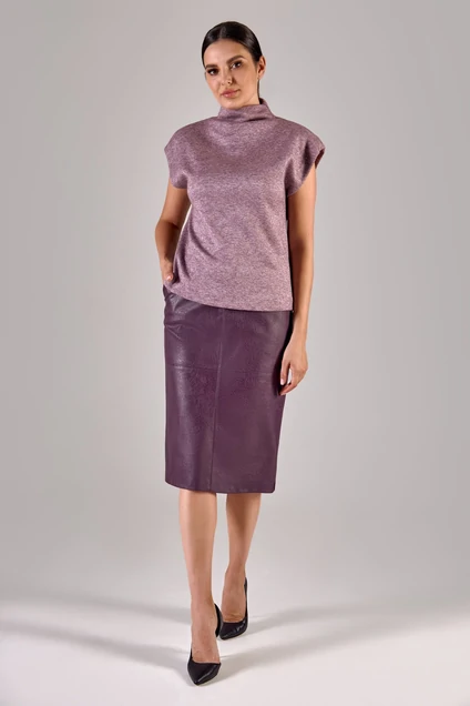 Костюм женский, состоящий из джемпера с цельнокроеным воротником и юбки. Джемпер прямого силуэта, выполнен из мягкого трикотажного полотна с добавлением ангоры. Юбка на подкладке полуприлегающего силуэта выполнена из эко-кожи. По переду юбки отделочные строчки, по спинке шлица. Застежка на молнию и пуговицу. Юбка: п/э 100%, эко-кожа на хлопковой основе.