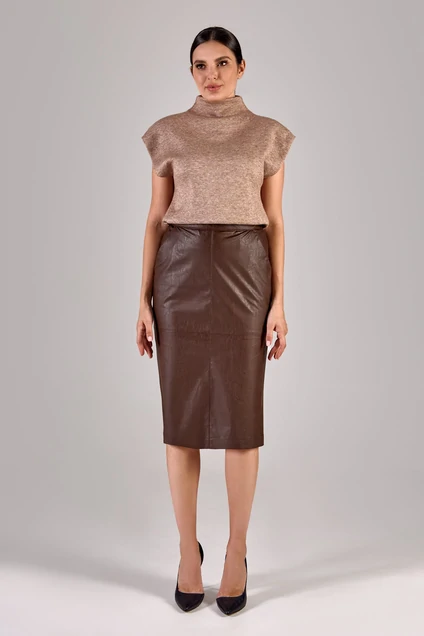 Костюм женский, состоящий из джемпера с цельнокроеным воротником и юбки. Джемпер прямого силуэта, выполнен из мягкого трикотажного полотна с добавлением ангоры. Юбка на подкладке полуприлегающего силуэта выполнена из эко-кожи. По переду юбки отделочные строчки, по спинке шлица. Застежка на молнию и пуговицу. Юбка: п/э 100%, эко-кожа на хлопковой основе.