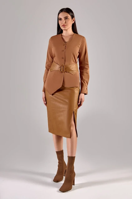 Костюм женский двухпредметный, состоящий из блузы, юбки и пояса. Блуза полуприлегающего силуэта с рельефами по переду и спинке. Горловина имеет V-образный вырез, застежка на петли и пуговицы. Рукава втачные с отрезными манжетами. Низ блузы ассиметричный. Юбка на подкладке полуприлегающего силуэта с завышенной линией талии, фигурный разрез по переду, потайная застежка в среднем шве. Комплект дополнен дизайнерским поясом ручной работы. Юбка:п/э 100%, эко-кожа на хлопковой основе.