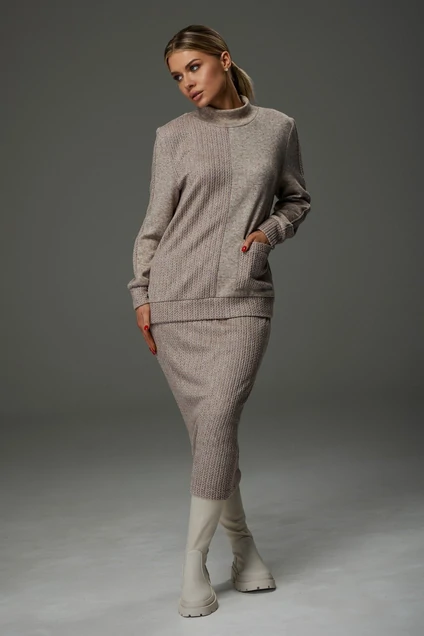 Костюм женский изготовлен из трикотажного полотна. Свитер прямого силуэта. Правая сторона свитера изготовлена из трикотажного полотна косичка.А так же карман,низ свитера, верхняя часть рукава, низ рукава и юбка. Воротник-стойка.