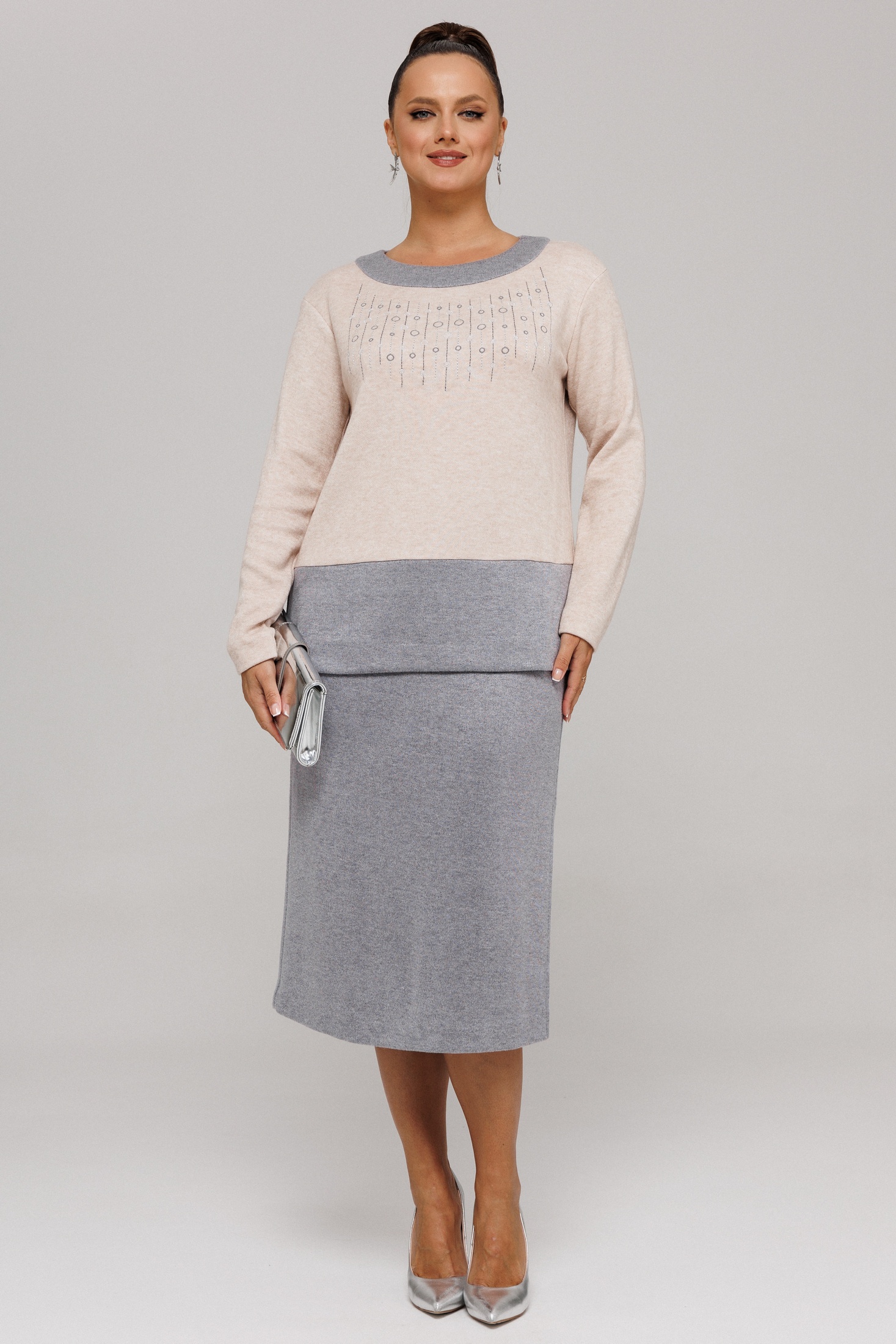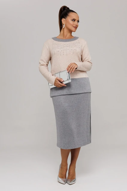 Джемпер данного комплекта прямого силуэта со спущенными рукавом, с планкой по горловине и подрезом ниже линия талии, выполненным из отделочной ткани. Декором данного джемпера служит дизайнерская вышивка
