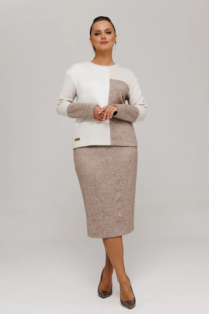 Идеальный демисезонный костюм для осени, выполнен из высококачественного трикотажа в сочетании разных цветов одной фактуры.Мягкий трикотаж с плотной фактурой придает образу винтажный шарм, а натуральные материалы обеспечивают причиные тактильные ощущения течение всего дня.Джемпер прямого силуэта, со спущенным рукавам, имеет дизайнерские членения по переду и рукавам.Горловина обработана планкой.