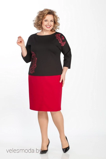 Блуза выполнена из трикотажного полотна с добавлением вискозных волокон. Блуза полуприлегающего силуэта. По переду блузы в области горловины выполнена вышивка в тон юбки. Спинка со средним швом, в котором обработана тесьма-молния. Рукав цельнокройный ¾.