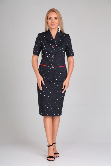 Комплект 2-х предметный. Жакет без подкладки с центральной застежкой на петли-пуговицы. Рельефы на спинке и полочке. Рабочие карманы с отделочными рамками красного цвета. Рукав втачной, короткий с патой на петлю -пуговицу. Юбка на широком поясе, зауженного к низу силуэта. Потайная молния и шлица в среднем шве задних половинок.