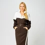Комплект 2-х предметный. Жакет на подкладке. Планка по горловине, край борта и манжет- из отдельной ткани. Пышный рукав со сборкой по окату рукава и низу рукава. Юбка на покладке. Верхний срез обработан поясом. Юбка зауженного к низу силуэта. Заднее полотнище с потайной молнией и шлицей в среднем шве. Ремень входит в комплект. длина жакета - 61см, длина рукава - 54см, длина юбки - 63см.