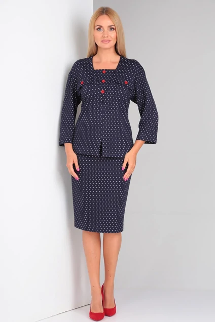 Комплект 2-х предметный. Блуза прямого силуэта, рукав втачной со спущенной линией плеча. Рукав 3/4. Клапаны декоративные, разрез в среднем шве полочки. Потайная молния в среднем шве спинки. Юбка на подкладке, зауженная к низу. Верхний край юбки на высоком поясе. Потайная молния и шлица в среднем шве задних половинок.