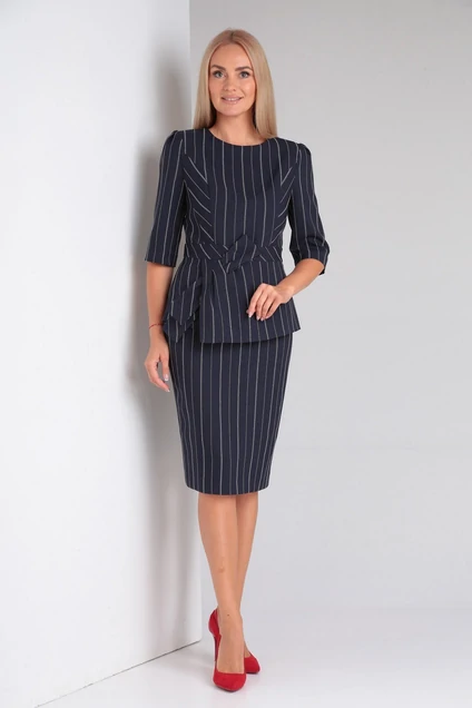 Комплект 2-х предметный. Блузон прилегающего силуэта из вискозной ткани в полоску. Верх лифа с двойными бочками и игрой полоски выигрошно смотрится на фигуре. Бока на подкладке от подреза по талии с ассиметричным низоми декоративным большим бантом, зафиксированом на баске. Спинка также с подрезом и баской. Длиная молния в шве спинки обеспечивает комфортное одевание блузы. Рукав втачной 3/4. Юбка на подкладке, верхний срез на поясе, с частичной резинкой по бокам. Шлица и потайная молния в среднем шве заднего полотнища. Пояс застегивается на петлю-пуговицу. Юбка зауженного к низу силуэта. длина блузона 59см, длина рукава 39см, длина юбки 64см