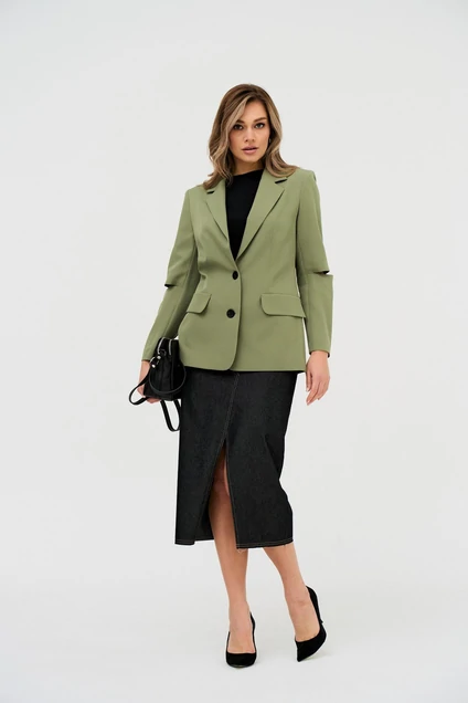 Костюм состоит из жакета, джемпера и юбки. Жакет полуприлегающего силуэта с однобортной застежкой на две петли и пуговицы и воротником пиджачного типа. По переду талиевая вытачка и рельеф. В районе талии настрочной клапан. Спинка со средним швом и рельефом. Рукав втачной двухшовный с прорезью в районе локтя. Жакет частично на подкладке. Джемпер прилегающего силуэта из эластичного трикотажного полотна. Горловина и окат рукава обтачаны узкой планкой. Юбка прямого силуэта из джинсовой ткани. Юбка на притачном поясе со шлевками. По переду застежка на молнию с гульфиком и фигурным разрезом. В боковой части переда карман с круглым входом. Задняя часть юбки с кокеткой и средним швом. Низ юбки с открытым срезом. Все швы отстрочены декоративной строчкой. Длина жакета - 70 см, длина рукава - 60 см, длина джемпера - 53 см, длина юбки с поясом - 82 см юбка - хлопок 69%, полиэстер 27%, эластан 4 %.