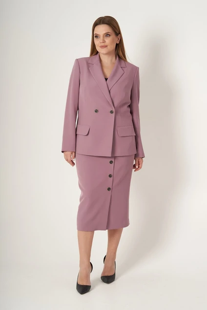 Костюм состоит из жакета и юбки. Жакет полуприлегающего силуэта с пиджачным воротником и центральной двухбортной застежкой на 2 петли и 2 пуговицы. Рукав втачной двухшовный. Перед с талиевыми вытачками и декоративными клапанами. Спинка со средним швом. Жакет на подкладке. Юбка прямая с притачным поясом на 1 петлю и 1 пуговицу. По поясу на уровне боковых швов-резинка. По переду смещенная складка, переходящая в шлицу с 6 декоративными пуговицами. Застежка на потайную молнию в среднем шве заднего полотнища. Юбка на подкладке. К комплекту прилагается декоративный съмный ремень. Фурнитура может быть изменена. Длина жакета по спинке-67см, длина рукава-61см, длина юбки-77см