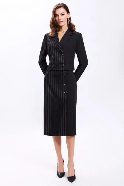 Костюм состоит из жакета и юбки. Жакет прямого силуэта с двухбортной застежкой на 4 пуговицы. Перед с рельефом из проймы. Спинка со средним швом и рельефом из проймы. Рукав втачной двухшовный. Воротник пиджачного типа. Правая часть переда, правый рукав, воротник- выполнены из отделочной ткани. Жакет на подкладке. Юбка прямая на обтачке. По переду смещенная складка, переходящая в шлицу, с 4 декоративными пуговицами. Застежка на потайную молнию в среднем шве заднего полотнища .Юбка на подкладке. Правая часть переднего полотнища выполнена из отделочной ткани. Фурнитура может быть изменена, сохраняя целостность художественного замысла. Длина жакета по среднему шву-46см (46и48размер),48см (50и 52размер), длина рукава-60см, длина юбки по боковому шву-72см.