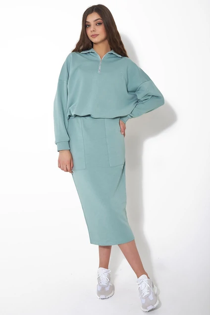 Стильный женский комплект, состоящий из юбки и свитшота с застёжкой молнией. Пошит из комфортной всесезонной ткани (петельного футера 3-нитки высшего качества пенье). Свитшот свободного покроя со спущенной линией плеча и длинным рукавом и воротником-стойкой. Стойка воротника свитшота имеет короткую застежку — молнию по центру переда. Низ свитшота дополнен кулисой и шнуром внутри для фиксации ширины изделия. Стойка, манжеты рукавов пошиты из ткани-компаньена кашкорсе. По центру переда свитшота вышит логотип в цвет ткани. Юбка длиной миди с разрезом на спинке. Спереди накладные удобные карманы. Пояс из ткани компаньона кашкорсе с резинкой внутри.Футер 3-нитка диагональ (без начёса) качества пенье.