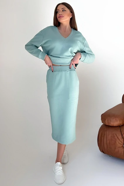 Женский комплект, состоящий из юбки и джемпера с v-образным вырезом. Джемпер классического покроя с немного спущенной линией плеча. Бейка горловины, манжеты рукавов и низ изделия выполнены из ткани-компаньена кашкорсе. Слева на переде свитшота вышит логотип в цвет ткани. Юбка длиной миди с разрезом на спинке. Спереди накладные удобные карманы. Пояс из ткани компаньона кошкорсе с резинкой внутри. Футер 3-нитка диагональ (без начёса) качества пенье.