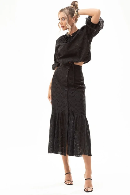Юбка с отрезным поясом, центральной застежкой на петли и пуговицы по планкам передних половинок. По низу юбки- отрезной волан. Юбка на подкладке.