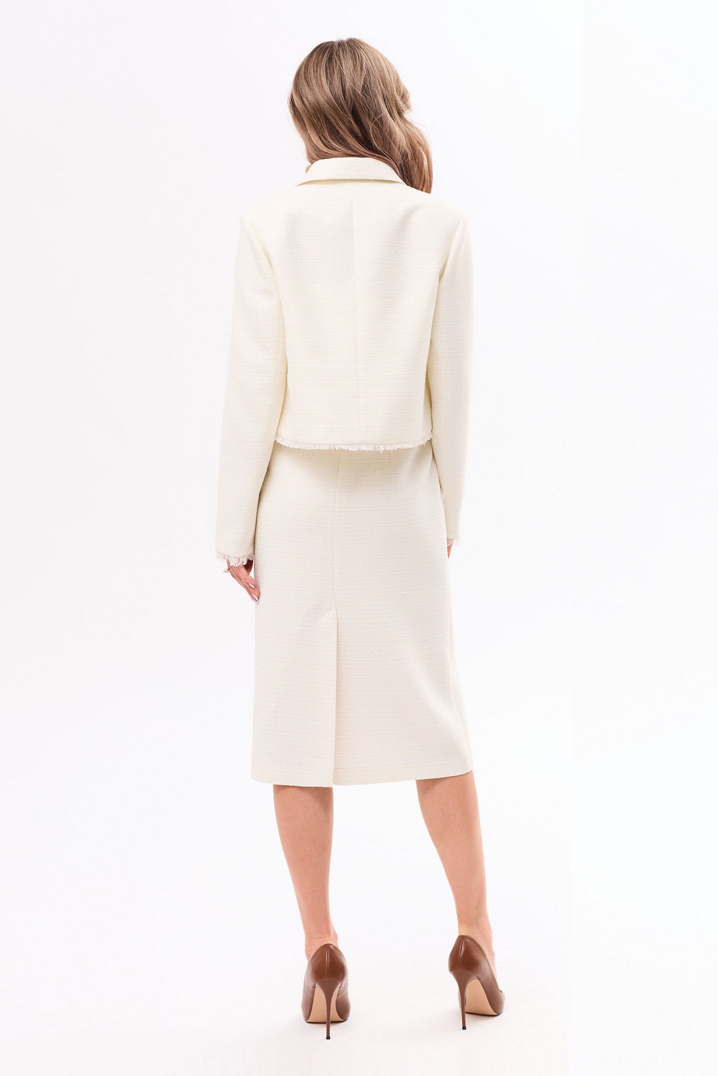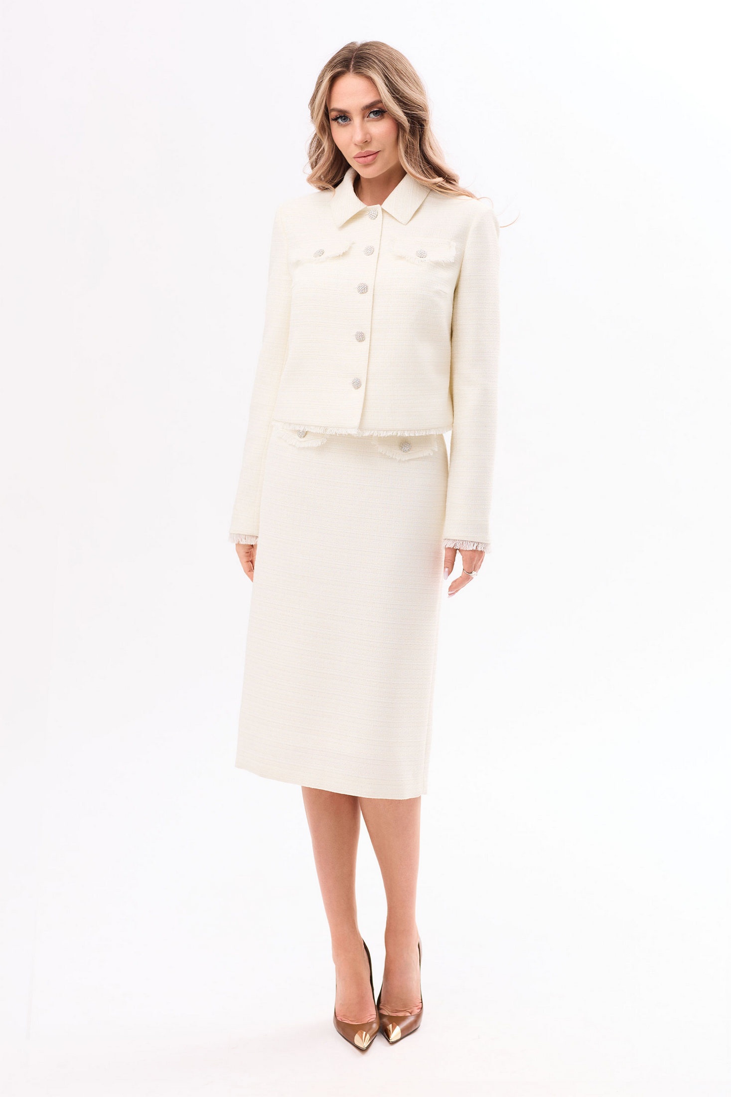 Костюм с юбкой 6607-1 Golden Valley – это отличный выбор для стильного образа. Коллекция бренда Golden Valley сочетает в себе элегантность и комфорт. Костюм выполнен из полиэстера и вискозы, что придаёт изделию прочность и приятные тактильные ощущения. Жакет с центральной застежкой на петли и пуговицы снабжен отложным воротником и нагрудными вытачками. Особое внимание привлекают клапаны с бахромой из основной ткани, добавляющие изысканности. Длинные рукава и бахрома по низу идеально подходят для осенне-весеннего периода. Юбка без пояса с застежкой на потайную молнию обеспечивает удобство использования. Молочный цвет костюма делает его универсальным вариантом для профессиональных и повседневных образов.