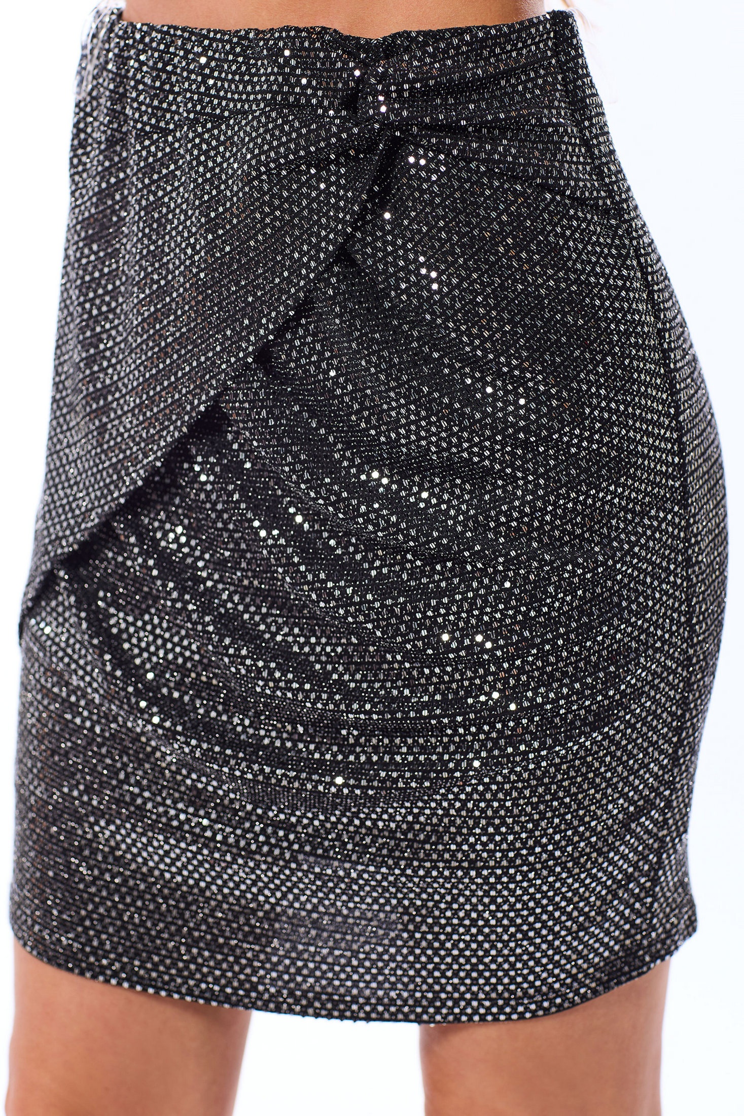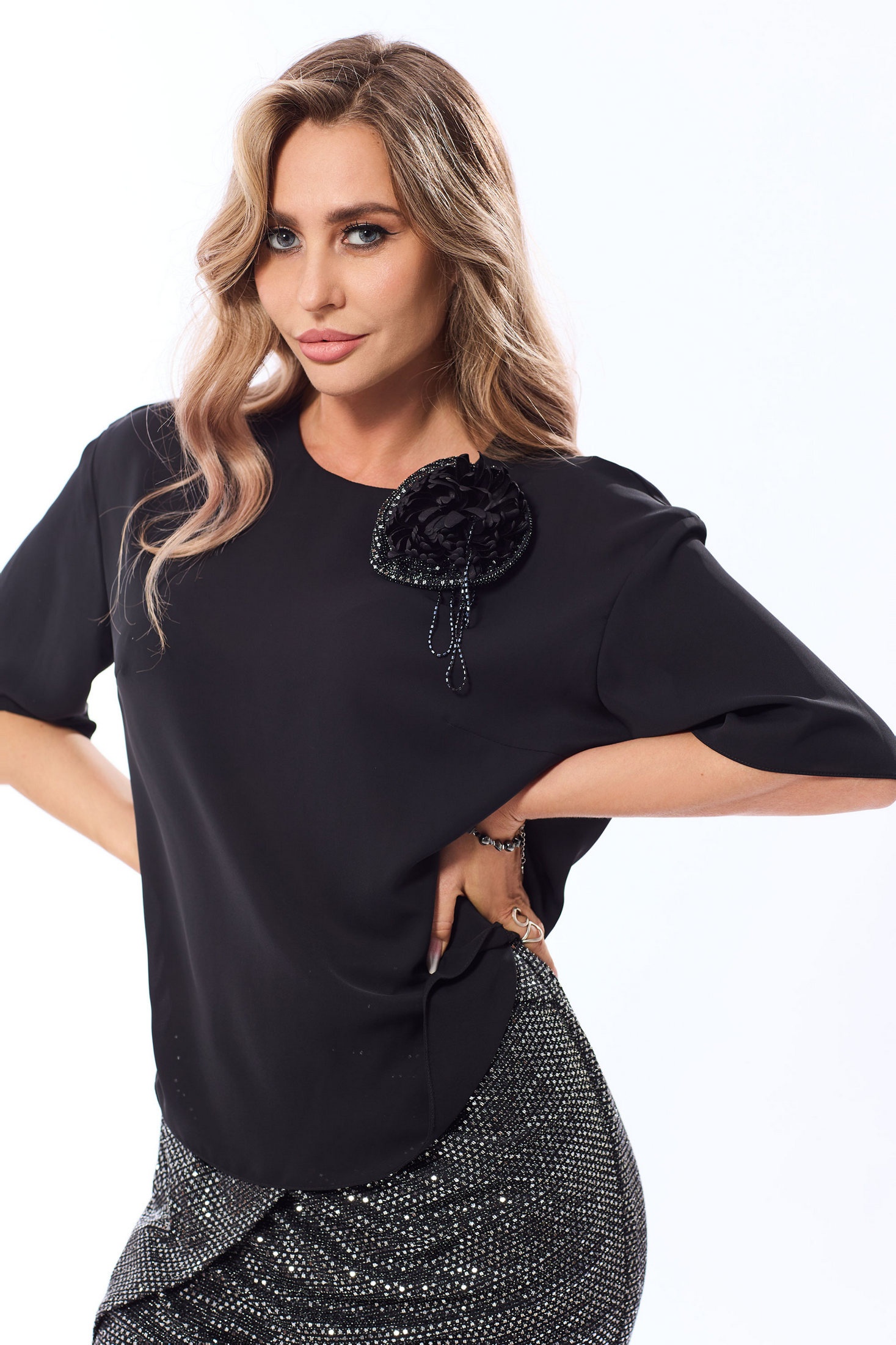 Блузка, без воротника, с круглым вырезом горловины. По переду с нагрудными вытачками. Спинка со средним швом и разрезом по горловине, застегивающимся на одну навесную петлю и пуговицу. Рукав втачной, короткий, плечо спущенное. Юбка, без пояса, верхний срез присборен на резинку. Переднее полотнище с отлетной деталью и декоративным узлом.